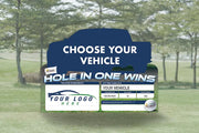 You will have the attention of golfers and spectators all day long, and memories of the amazing hole will be enmeshed with your company’s logo or name. Square cardboard sponsorship signs are a marketing ploy of the past. Now modern materials and custom cut signs are what stands out for advertisements. If you are going to choose a Hole in One Contest do it right with quality materials and stand out graphics.